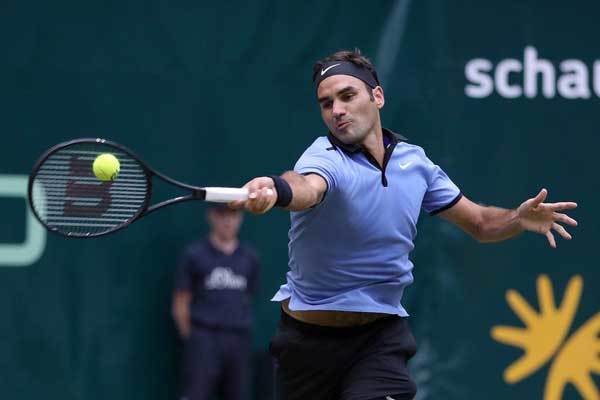 6月24日,瑞士选手费德勒在比赛中回球。 当日,在德国哈雷举行的2017年格里韦伯网球公开赛男单半决赛中,瑞士选手费德勒以2比0战胜俄罗斯选手哈恰诺夫,晋级决赛。